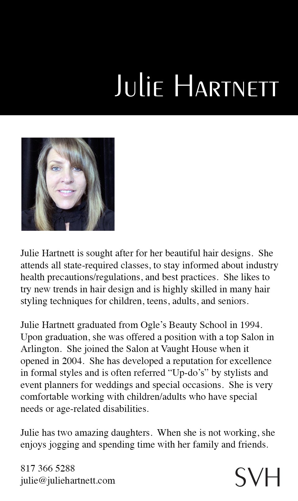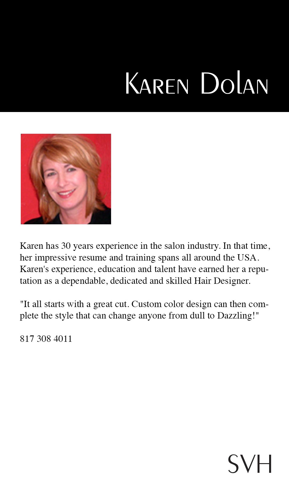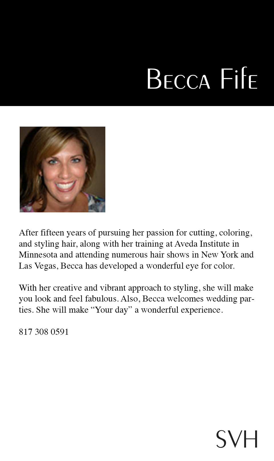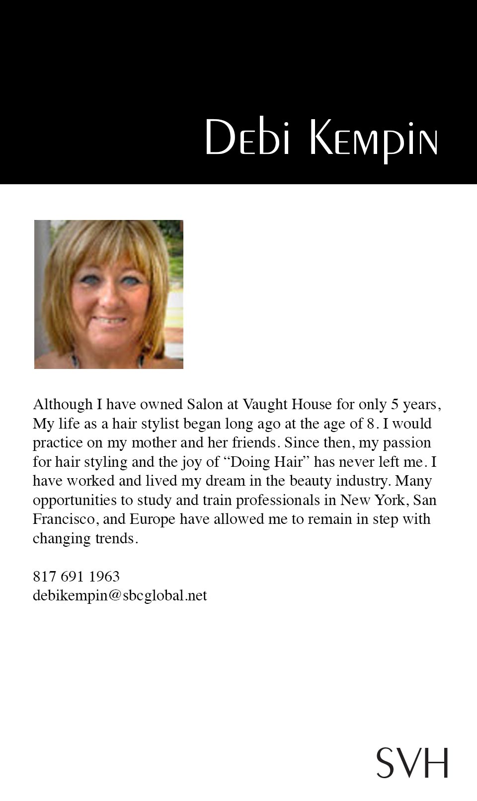 Hairstylists at Salon at Vaught House work independently. Please contact the hairstylist of your choice from the list below, or learn more about each hairstylist by clicking on the head shots to read comp cards.